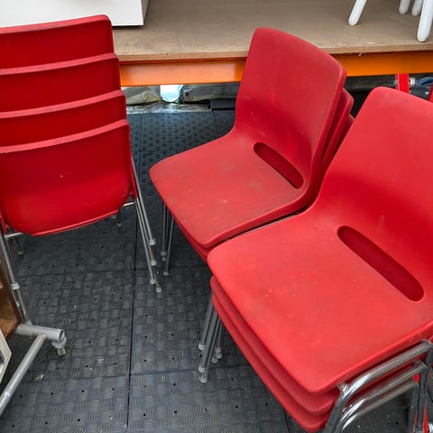 Pris per stk: 30 kr. eller 200 kr. for alle 8 stole (stk. pris 25 kr.)