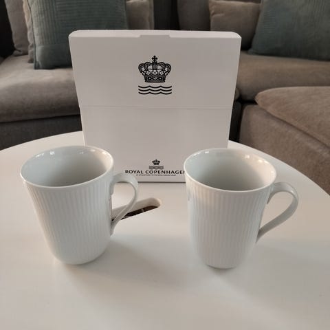 Royal Copenhagen 33 cl krus i hvidt porcelæn. Krusene har rillet struktur og hank, velegnet til varme drikke som kaffe, te eller kakao. Klassisk, neutralt design der passer ind i de fleste stel og borddækninger.