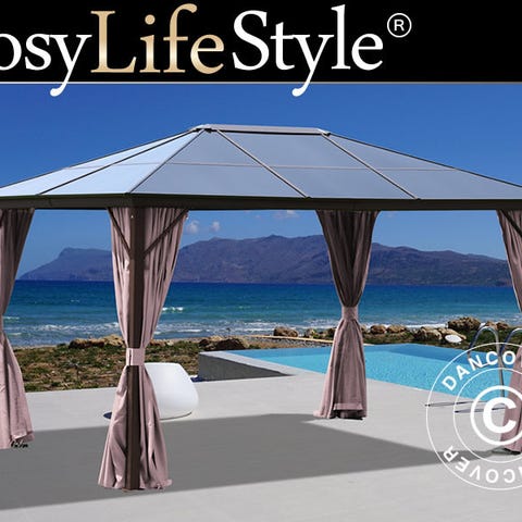Elegant pavillon i et moderne design med metaltag, sidevægge/gardiner og myggenet. Materialerne i høj kvalitet gør pavillonen vedligeholdelsesfri og ekstremt holdbar. Brug de medfølgende gardiner/sidevægge og myggenet til at skabe endnu mere skygge og læ. Den elegante havepavillon vil skabe en fantastisk atmosfære i din have og hurtigt blive det naturlige samlingspunkt i haven.