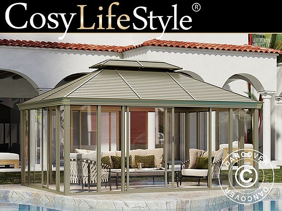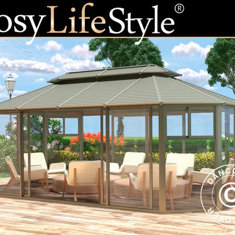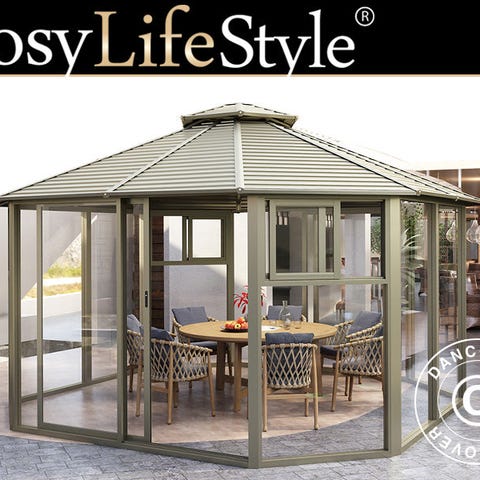 Denne elegante, moderne pavillon har sidevægge i 5 mm polycarbonat og et pulverlakeret metaltag. Den har fire vinduer og fire dobbelte skydedøre. Materialerne i høj kvalitet gør pavillonen vedligeholdelsesfri og meget holdbar. Den smukke pavillon vil skabe en skøn stemning i din have, hvor du kan nyde både ly og skygge, og det vil hurtigt blive et naturligt sted at mødes og være.