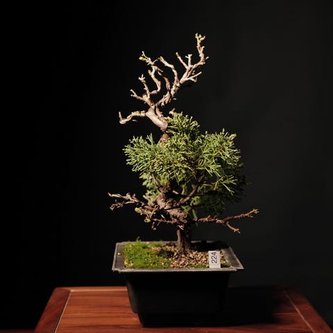 Juniper shimpaku. (nr 554). 18cm. Shohin. Stilfuldt træ. Wiret og stylet. Efterårgødet med henblik på knopsætning og udvikling af rodnettet. Udendørs træ.