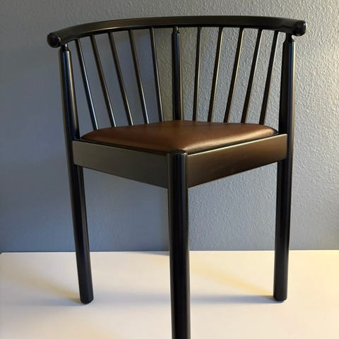 Denne stol er fremstillet i formspændt eg med sort skind på sæde.