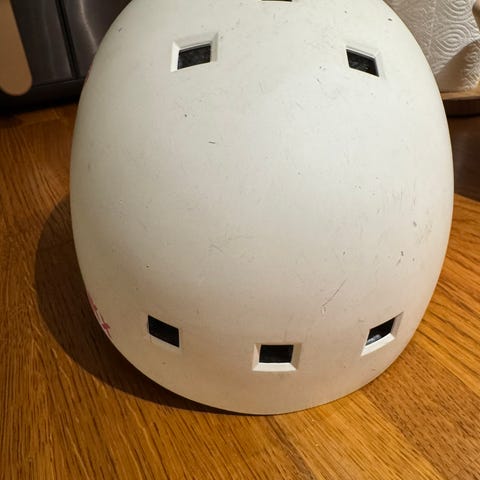 Cykelhjelm i størrelse medium i hvid. Hjelmen har mange ventilationshuller og justerbart spændesystem med remme under hagen. Indersiden er polstret for øget komfort. Velegnet til cykling i hverdagen eller fritiden.