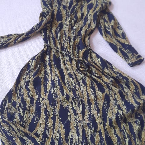 Kjolen har lange ærmer, let asymetri ( længere forneden) hvilket giver et smukt snit, gennemgående knapper samt bindebælte.