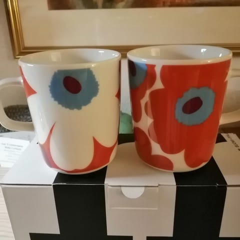Marimekko Unikko krus med hank. Kruset er dekoreret med det karakteristiske Unikko-blomsterprint i flere farver på hvid baggrund. Velegnet til varme og kolde drikke i hverdagen eller til servering. Fremstillet i hårdt materiale, egnet som køkkenservice til borddækning og brug i køkkenet.
