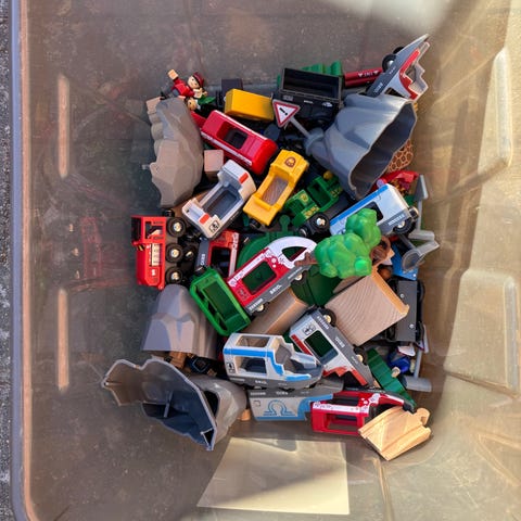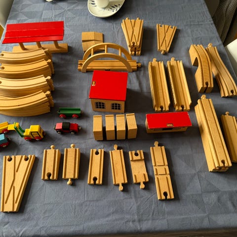 En stor velholdt Brio togbane med 38 buede og 24 lige togskinner, 2 delespor, gangbro, togbro, bom overgang, en togperron, 3 tog med 3 vogne, 2 togskilte, 12 buske/træer og 5 huse i en klar plastkasse. Det hele vejer 4,8 kg. Sælges til fast samlet pris + evt dao fragt.