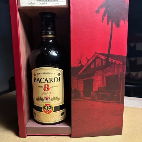 Bacardi Reserva Ocho rom 8 år, rare gold rum. Flasken indeholder 1 liter rom med en alkoholprocent på 40 %. Produktet er tappet som en 8 års rom og er angivet som produkt fra Puerto Rico. Velegnet til servering rent eller i forskellige rombaserede drinks og cocktails.
