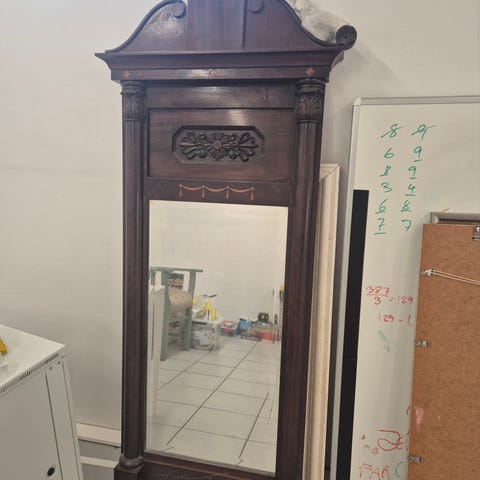 Spejlet har en ramme i mørkt træ med fine detaljer og en ornamenteret top i messing. Selve spejlet er facetslebet. Det måler 47x87