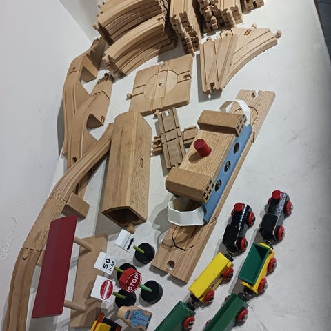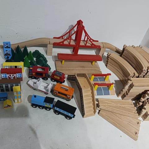En stor og velholdt Brio togbane med 38 buede og24 lige togskinner, et krydsspor, et drejbart krydspor, 2 dele spor, 2 tog med 4 vogne, en togperron, 5 skilte, en togbro, en togbro med 2 bomme og hejsbar bro, Det hele vejer 5,8 kg og sælges til fast pris + evt. Dao fragt