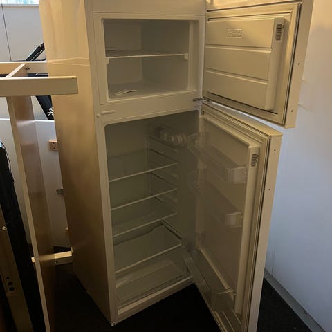 Point kølefryseskab i hvid. Fritstående model med køl øverst og fryser nederst. Skabet har elektronisk display på fronten til indstilling og aflæsning af temperatur. Bagsiden viser kompressor og tilslutninger. Der ses enkelte kosmetiske mærker på siden af kabinettet.