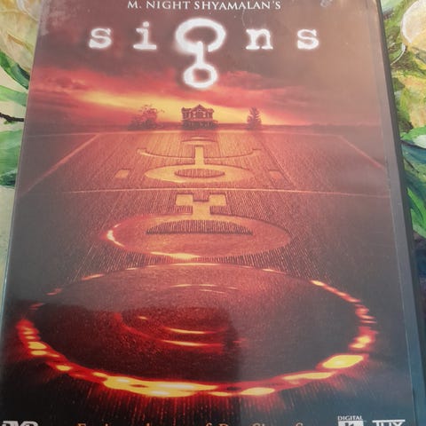 Signs dvd film. Thriller- og science fiction-film instrueret af M. Night Shyamalan med Mel Gibson i hovedrollen. Med dansk tekst ifølge cover. Format: dvd.