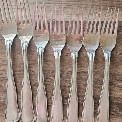 Atla bestiksæt i rustfrit stål. Sættet består af forskellige dele, herunder gafler, skeer, teskeer, serveringsskeer og små gafler. Bestikket har et enkelt, tidstypisk mønster på skaftet og er egnet til daglig brug ved spisebordet. Materialet er rustfrit stål, som er let at rengøre og kan anvendes til både hverdag og mere formelle måltider.