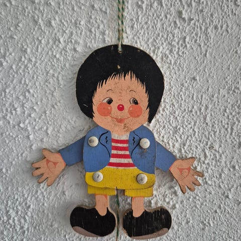 Tysk sprællemand fra omkring 1930'erne. Dens snoretræk er blevet lidt stive med tiden. Venstre underben er løsnet lidt men fungere.