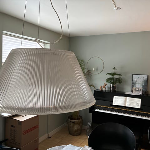 Flos Romeo Moon designet af Philippe Starck. Lampen har en kegleformet, klar skærm med rillet struktur, der giver et diffust og behageligt lys. Inderskærmen er matteret for at reducere blænding. Egnet som belysning over spisebord, i stue eller køkkenalrum. Leveres som loftpendel med ophæng i wirer og ledning til montering i loftudtag.