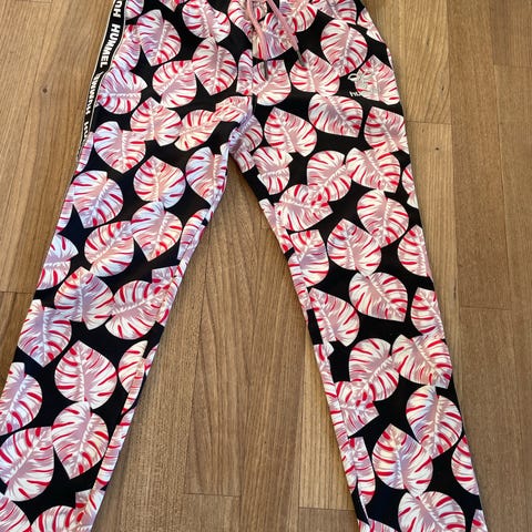 Bukserne har et farverigt mønster med pink nuancer mod en mørkeblå baggrund. De har UV-beskyttelse og er lavet af et strækbart materiale. Der er en tydelig hvid zigzag-stribe på siden.