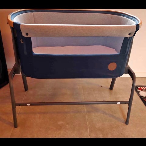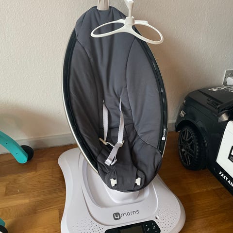 babyswing i grå og hvid. Sædet har polstret indsats og sele til fastspænding af barnet. Swingen står på et fritstående stativ med buede ben. Velegnet som hvilested til spædbørn og mindre børn i hjemmet. Farverne er neutrale og passer ind i de fleste boligindretninger.