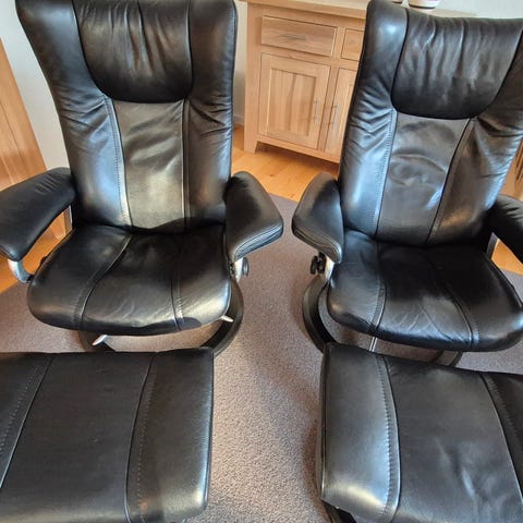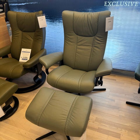 Flot Stressless® Wing L Cross i blødt Paloma læder og i farven mushroom inkl skammel - købt i januar 2024