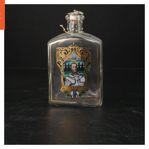 En keramikflaske med tekst 'Bitter Dram' på forsiden. Flasken har en korkprop og en håndtag, der gør den nem at bære. Den øverste del er brun og den nederste del har en naturlig lerfarve. Flasken er mærket på bunden med 'Moira Handcrafted Stoneware Made in England'. Farven på flasken er brun og lerfarvet. Den måler 19 cm i højden og er ideel til opbevaring af væsker eller som dekoration.