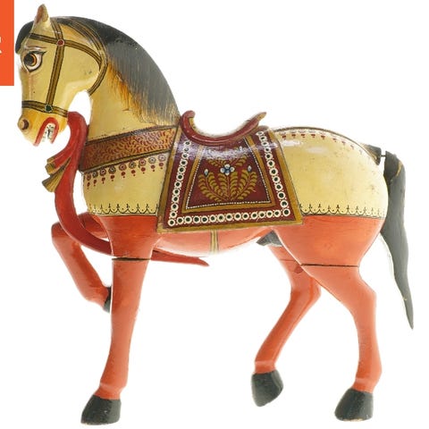 Denne figur er en terrakotta-hest med en bemærkelsesværdig kunstnerisk udførelse. Figuren er 12x16 cm stor og fremstillet med fine detaljer, der indikerer en håndlavet kvalitet. Den har en traditionel stil med dekorative mønstre og symboler, som er integreret i designet. Terrakotta-materialet giver figuren en naturlig rødbrun farve, der passer godt til både indendørs dekoration og samlinger.
