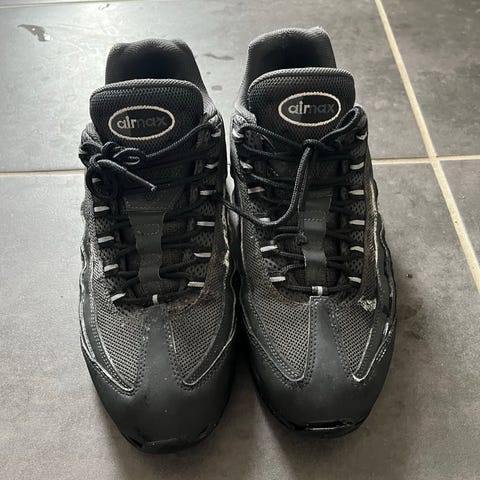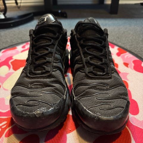 Nike Air Max Plus sneakers i størrelse 46. Modellen er i en mørk, overvejende sort farve med karakteristiske Air Max Plus-detaljer, herunder TN-logo på pløs og hæl samt Tuned Air-dæmpning i sålen. Overdelen er i syntetisk materiale med snørelukning og gummisål. Velegnet som hverdagssko eller fritidssko.