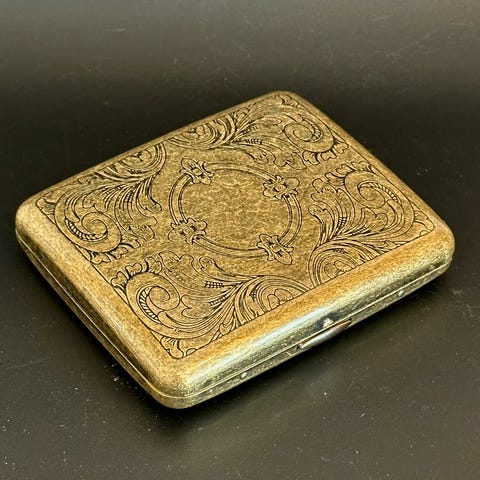 Retro cigaretetui, der måler 13x9 cm. Etuiet er lavet af brunt læder med en gullig metalramme, der skaber et elegant udseende. Denne cigaretetui kan opbevare cigaretter med stil og beskytter dem imod skader. Perfekt til samlere eller dem, der sætter pris på vintagestil.