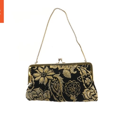 Denne genstand er en vintage taske med en elegant kæde og snap lukning. Tasken har et mønstret design med plys, der giver et sofistikeret look. Den øverste del af tasken er lavet af metal og har en guldfarve. Tasken måler 14x17 cm og er ideel til at bære små personlige genstande.