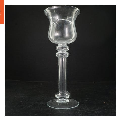 Denne glasslysestage har en størrelse på 11x14 cm og er designet til at holde et enkelt lys. Den har en rund base og en cylindrisk midtersektion. Overfladen viser nogle tegn på brug med voksrester og pletter.