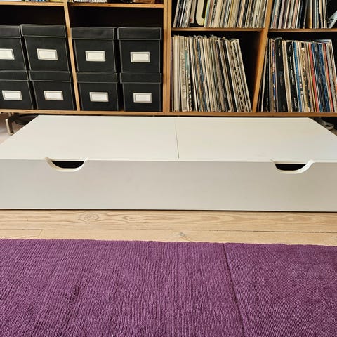 Har ialt 3 skuffer på hjul. De er løse og kan trækkes helt ud for nem adgang til opbevaring af f.eks. sengetøj eller legetøj. Hvidlakeret træ.