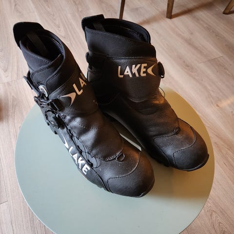 Lake MX146 cykelsko i størrelse 42. Modellen er designet som en lukket sko med overtræk og justeringsspænde på vristen. Skoene er sorte med grov ydersål og klampebeslag til klikpedaler. Velegnet til cykling, hvor der er behov for en robust sko med god beskyttelse mod vej og underlag.