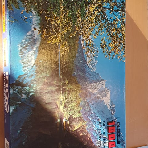 Puslespil med 1000 brikker, som viser et smukt naturbillede med skove og søer. Puslespillet er pakket i en solide æske med dimensioner 48,5 x 67 cm. Det er ikke monteret og leveres som løsdele i en plastikpose. Mærket er Euro Puzzle, fremstillet i Holland.