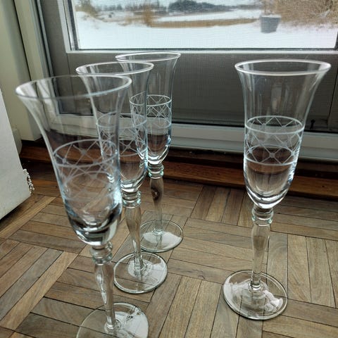 Sæt af seks klare glas med en elegant og struktureret fod. Glassenes størrelse er 17x6 cm, hvilket gør dem velegnede til servering af drikkevarer. De er gennemsigtige og fremstillet af glasmateriale, hvilket giver dem et klassisk udseende.