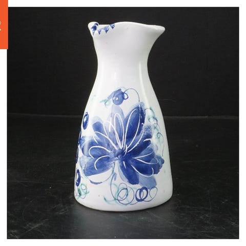 En dekorativ keramikkande med et farverigt mønster af blå og gule striber, samt grønne detaljer. Kanden har en traditionel form med en rund bund, en bred åbning og en enkelt hank, som gør den let at hælde fra. Den måler Ø 6x8 cm, hvilket gør den ideel til at servere små mængder væske.