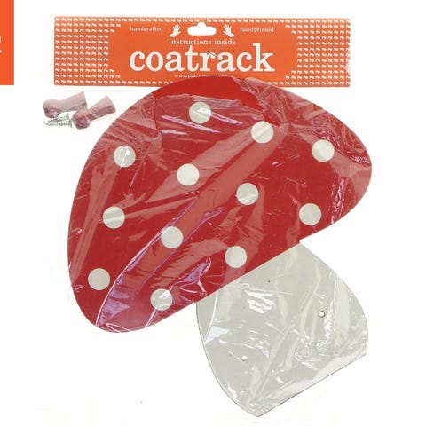Svampeknagen har en flot rød top med hvide prikker og leveres med en skrue for nem montering af knop/knage. Den er designet til at blive hængt op på væggen og er ideel til at hænge tøj eller tasker. Bagsiden afslører de to monteringspunkter og har en webadresse påtrykt, hvilket antyder producentens eller designerens webside.
