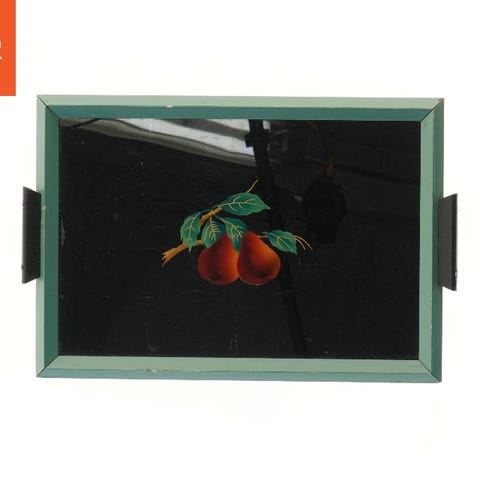 Denne halv-måneformede bakke har en afbildning af marcherende gardere i røde uniformer foran en bygning, der ligner Amalienborg Slot. Objektet er lavet af et hårdt materiale og har en størrelse på 44x29 cm. Bagsiden af dekorationen er tom, og kan måske hænge på en væg eller stilles op som en del af interiørdesign.