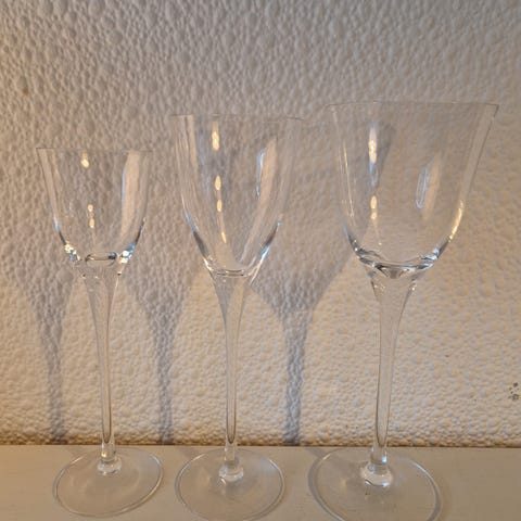 60 glas ialt. 12 rødvin, 12 hvidvin, 12 vand/dessert, 12 sherry/portvin 12 snaps. Glassene har stilk og rund fod og fremstår i forskellige størrelser, egnet til fx rødvin, hvidvin eller dessertvin. Enkle, gennemsigtige glas uden dekoration, som passer til almindelig borddækning og brug i hjemmet.