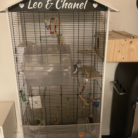 Bur + ekstra fuglesager følger med i prisen.