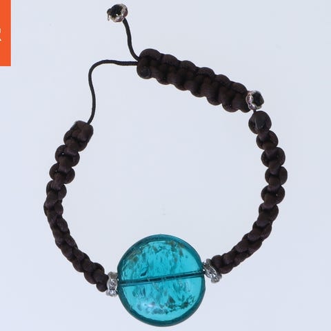 Dette er et enkelt smykke vedhæng lavet af blå glas, fastgjort til en sort snor. Vedhænget har en rund form og er bundet med en knude på snoren. Snoren kan justeres i størrelse til at passe som ønsket. Ideelt for dem der ønsker at tilføje et farverigt element til deres smykkekollektion.