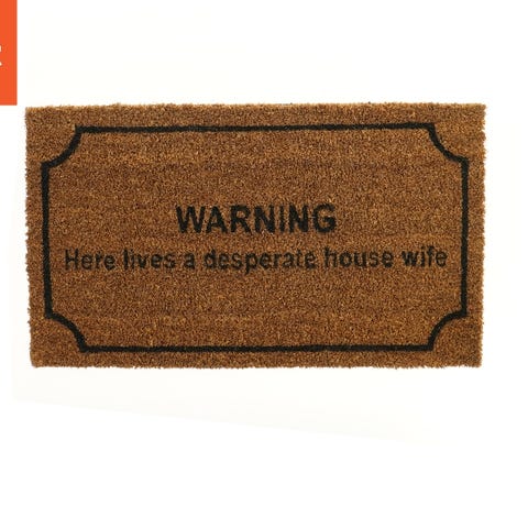Denne dørmåtte er lavet af kokosfibre og har en sjov tekst i sort, der advarer om, at her bor en desperat husmor. Den måler 40x70 cm og er egnet til at placere ved indgangen for at byde gæster velkommen med et humoristisk touch.