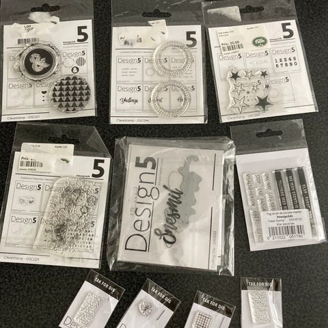 Stor samling til kreative projekter: papir i forskellige designs, stempler (bl.a. One Little Word), udstansere, lommer og diverse småting. Perfekt til scrapbooking, kortfremstilling og journaling. Alt i god stand og klar til brug.