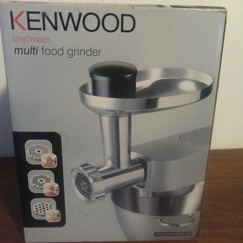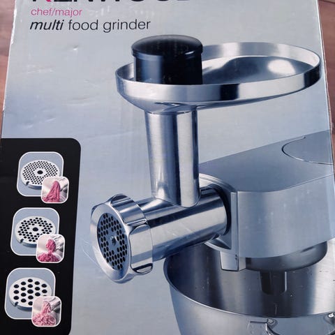 Kenwood Chef/Major AT950A kødhakker til køkkenmaskine. Tilbehør til Kenwood Chef og Major køkkenmaskiner, beregnet til at kværne kød og andre råvarer. Sættet består af kødhakkerhus, påfyldningstragt, stamper og tre hulskiver til forskellige grovheder. Velegnet til tilberedning af hakkekød, fars, pølsefars og lignende i husholdningen. Aldrig brugt.