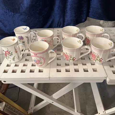 Hvid krus med blåt blomstermønster (str. 13x11,5 cm)
