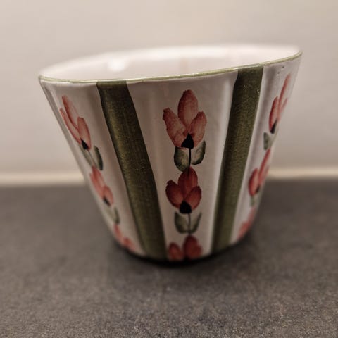 Smuk urtepotte i sort med farver i blå, gul, rød og grøn