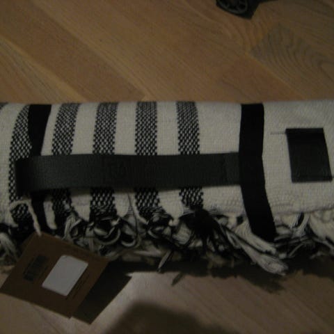 Dette er et picnic tæppe fra mærket Juna. Tæppet er designet i en enkelt og stilfuld sort-hvid stribet mønster med frynser i enderne. Det er lavet af kvalitetsmateriale og har en størrelse på 200x74 cm, hvilket gør det perfekt til udendørs brug som picnics eller strandudflugter. Tæppet er rullet sammen og fastholdt med en praktisk rem, der gør det nemt at transportere.