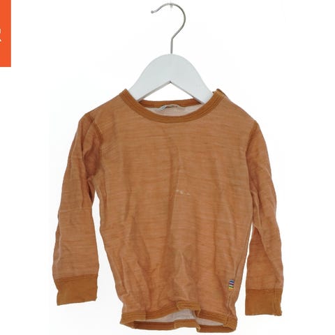 Børnebluse med lange ærmer og lynlås på fronten. Blusen er orange med en ribbet krave og manchetter. Der er ingen synlige mærker eller størrelsesangivelser.