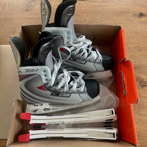 Nike ishockey skøjter i sort og grå. Skøjterne har snørelukning og fast hælkappe for støtte omkring anklen. Understel i hvid plast med stålskinner. Velegnet til ishockey og generel skøjteløb på is.