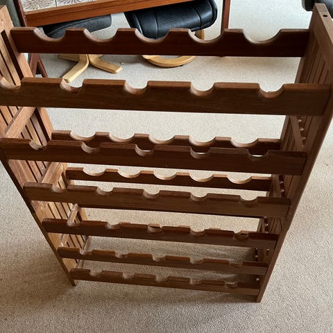 Vinreol til opbevaring af vin i f.eks. kælder, køkken eller spisekammer sælges. Reolen består af 8 hylder med plads til 8 flasker på hver hylde - i alt 64 flasker. Reolen er solid og i naturfarvet træ. Reolen er brugt, men der er ingen synlige brugsspor og fremstår i virkelig god stand.