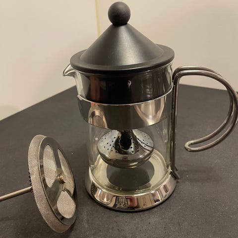 Tekande med varme. Foden har et fyrfadslys der holder teen varm. Beholder til te der let tages op og kan genbruges. 17 cm høj og 10 cm i diameter. Foden er 6 cm høj. Meget eftertragtet dengang den kunne købes.
