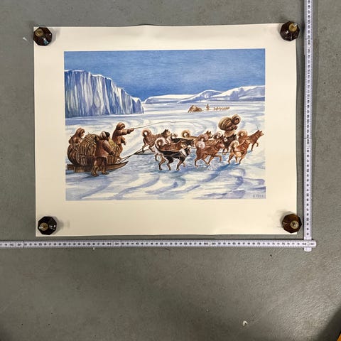 To illustrationer til Elmar Drastrups beretning Et arktisk Eventyr, fra bogen Fra Pol til Ækvator - Eventyrerne fortæller, 1944. Ca A4. Har været foldet på midten. Elmar Drastrup (1909-81) deltog blandt andet i Den Danske Hundeslædeekspedition 1938-39. Samlet pris 500 kr.