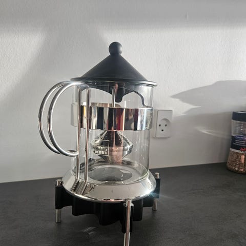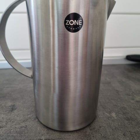 Kanden kan bruges både til te og som stempelkande. Aldrig brugt. Indmaden skiftes let. God til det lille køkken. 15 cm høj og 10 cm i diameter.