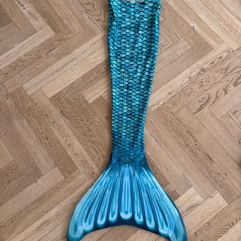 Fin Fun havfruehale Youth i størrelse L. Modellen er beregnet til børn/unge og har turkis mønsterprint, der efterligner fiskeskæl og hale. Stoffet er elastisk og sidder som et hylster omkring benene.
